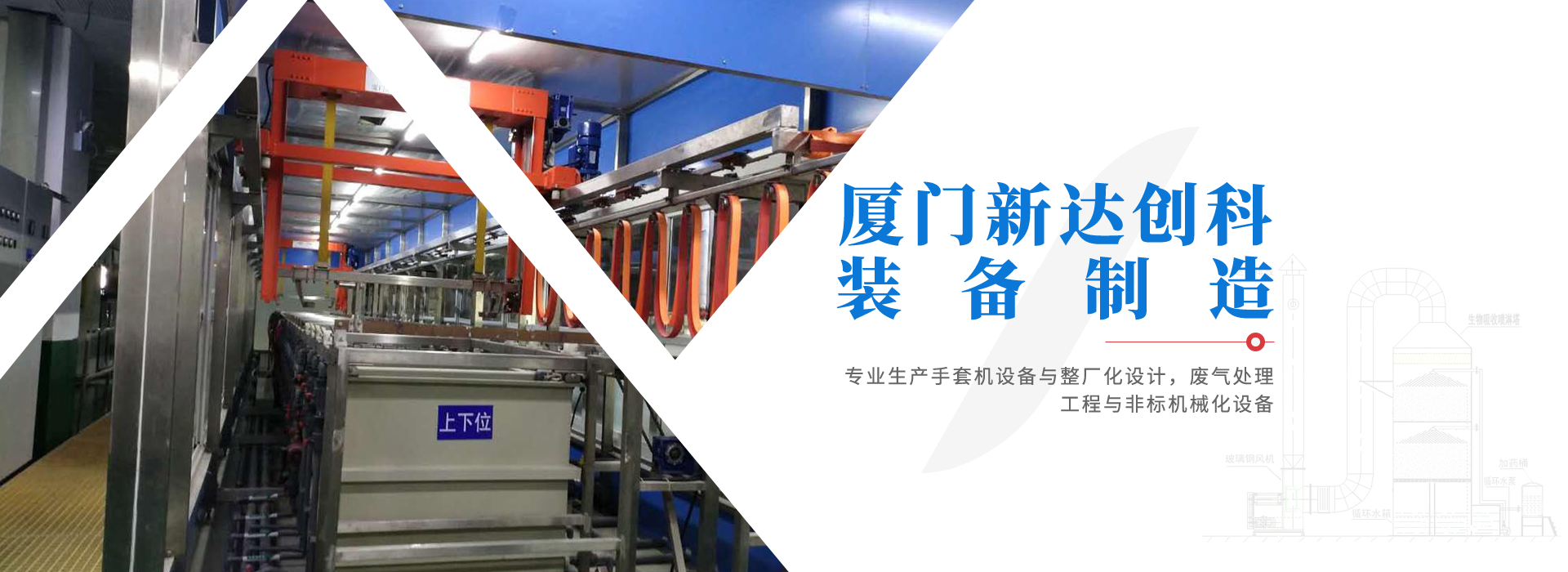廈門新達創科裝備制造有限公司,成立于2016年6月份,是一家生產手套機設備與整廠化設計,廢氣處理工程與非標機械化設備的制造廠商,位于廈門市集美區,至今已累積多年的技術與經驗,一路秉持【品質、效率、服務】的精神理念,為客戶設計完善的生產設備,并不斷的研究開發、改善、創新,加強技術提升,制造達到符合要求的自動化電鍍設備與環保設備。